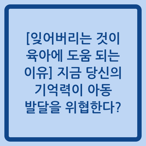 많은 부모는 완벽한 양육을 추구하며 모든 세부 사항을 기억하려 애쓰지만, 이는 오히려 스스로를 지치게 하고 불필요한 스트레스를 유발한다. 아이의 발달은 예측 불가능한 변수들로 가득하며, 모든 것을 통제하려는 시도는 좌절감을 안겨줄 수 있다. 잊는다는 것은 과거의 경험에 얽매이지 않고 새로운 상황에 유연하게 대처할 수 있는 인지적 여유를 제공한다. 이는 긍정적인 정서 조절 능력과 문제 해결 능력을 향상시키는 데 중요한 역할을 한다. 육아정책연구소의 2022년 양육자 스트레스 조사에 의하면, 과도한 양육 정보 습득과 완벽주의적 태도가 높은 스트레스 지수와 유의미한 상관관계를 보였다. 모든 것을 기억하려는 강박은 정신 건강에 해로운 영향을 미친다. 부모가 모든 것을 기억하려 하지 않고, 때로는 중요한 순간에 집중하기 위해 다른 것을 잊는 선택을 하는 것은 뇌의 자연스러운 인지적 필터링 과정으로 이해된다. 이는 양육이라는 복잡한 과업을 수행하는 데 있어 필수적인 유연성을 제공한다. 특정 정보를 잊는 과정은 부모가 고정관념에서 벗어나 아이의 개별적 특성에 맞춰 양육 방식을 조절하게 돕는다. 아이가 실수했을 때도 부모의 단기적인 실수를 ‘잊고’ 넓은 마음으로 바라볼 수 있는 심리적 토대가 된다.